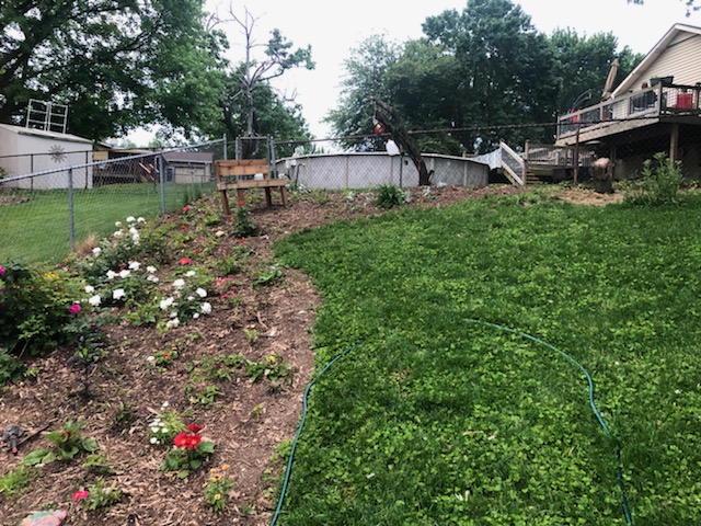 When I planted the original 10 or so roses I put them in the grass and just mowed around them. I did eventually add mulch to the area, along with a bench, and summer annuals. The below pictures are from when I first added the summer annuals to the main rose garden, I have a few in a couple of areas elsewhere in the yard. The pictures are also of tonight with the roses blooming in it. I plan on updating this as my rose garden blooms and grows.